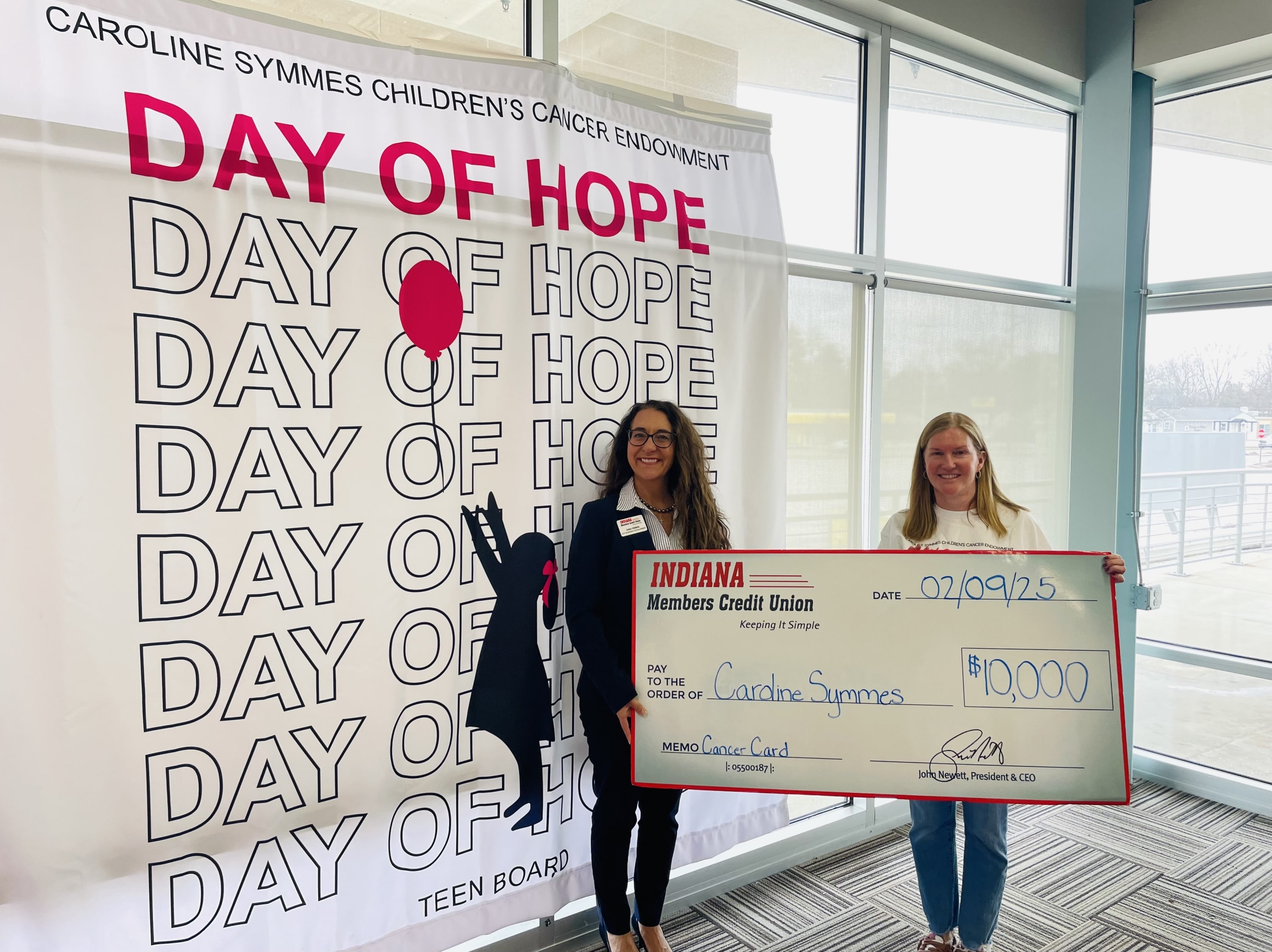 On behalf of Indiana Members Credit Union (IMCU) members, IMCU recently presented a check for $10,000 to the Caroline Symmes Children's Cancer Endowment as part of its exclusive Cancer Awareness Debit Card Program. IMCU members nominate a different local cancer related organization to be the beneficiary each year. Caroline Symmes Children's Cancer Endowment was the selected beneficiary for the past year, receiving a contribution for each signature based transaction made with this card from March 2024-February 2025.